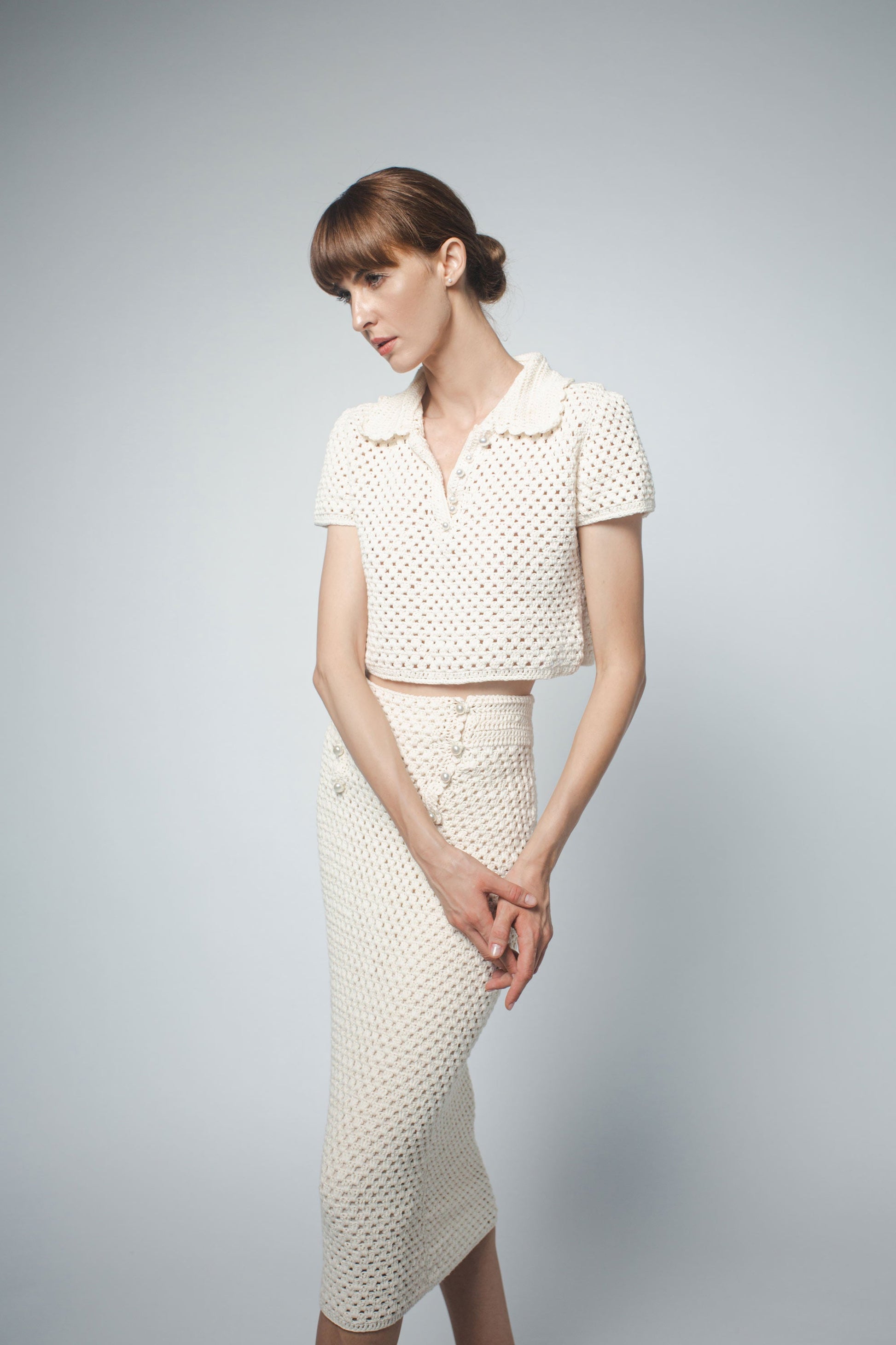 MARGOT HAND CROCHET CROPPED POLO IN PEARL